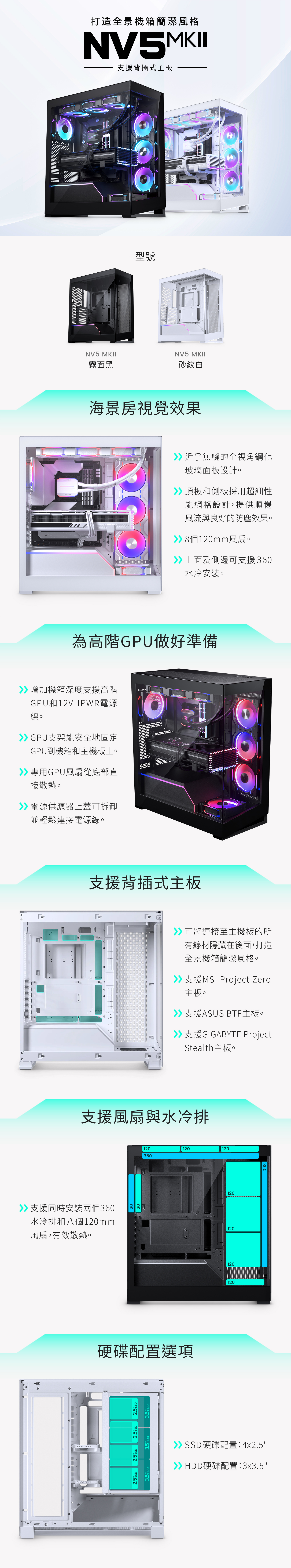 NV5 MKII 中塔機箱支援背插式主板,打造全景機箱簡潔風格。其幾乎無縫的玻璃面板以時尚的方式展示硬體,同時支援高達 8 個 120mm 風扇和兩個 360 水冷散熱排,以實現最佳散熱效果。NV5 MKII 中塔機箱輕鬆容納高階顯示卡和供電線,並配有可拆卸的電源供應器艙蓋,便於電源線材管理。可自定義的集成 DRGB 燈效和可選的 NV5 DRGB 燈效套件(需另行購買),為組裝提供了個性化選項。