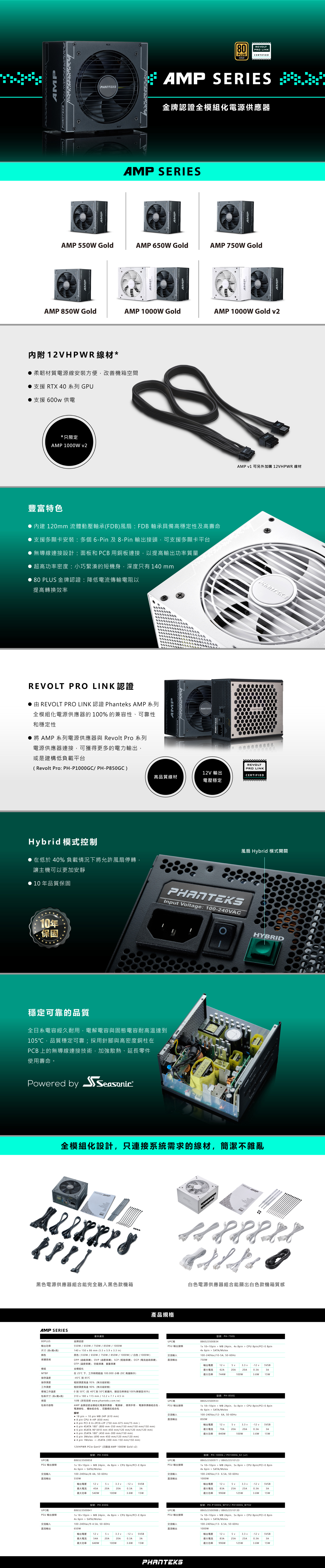 Phanteks AMP系列是與Seasonic共同合作開發之產品,高品質80PLUS金牌認證電源。全模組化導線可以大幅度減少連接電線雜亂的現象,使用套管和扁平帶狀電纜,使系統安裝後更為簡潔美觀。120mm流體動力軸承風扇可在混合風扇模式下進行溫度控制,實現極致的靜音性能。 Phanteks AMP電源經過認證,可確保與Revolt Pro電源供應器100%兼容。