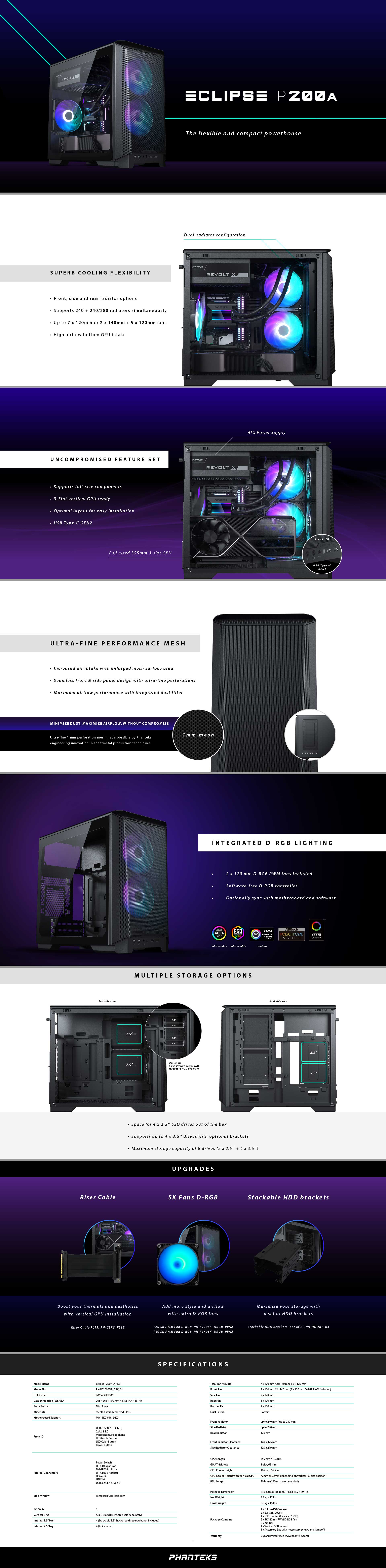 Eclipse P200A以Ultra-fine多功能高密度面板為特點,帶來最佳散熱性能及防塵效果,同時結合小巧開放式的內部空間,足以容納高階硬體設備。
