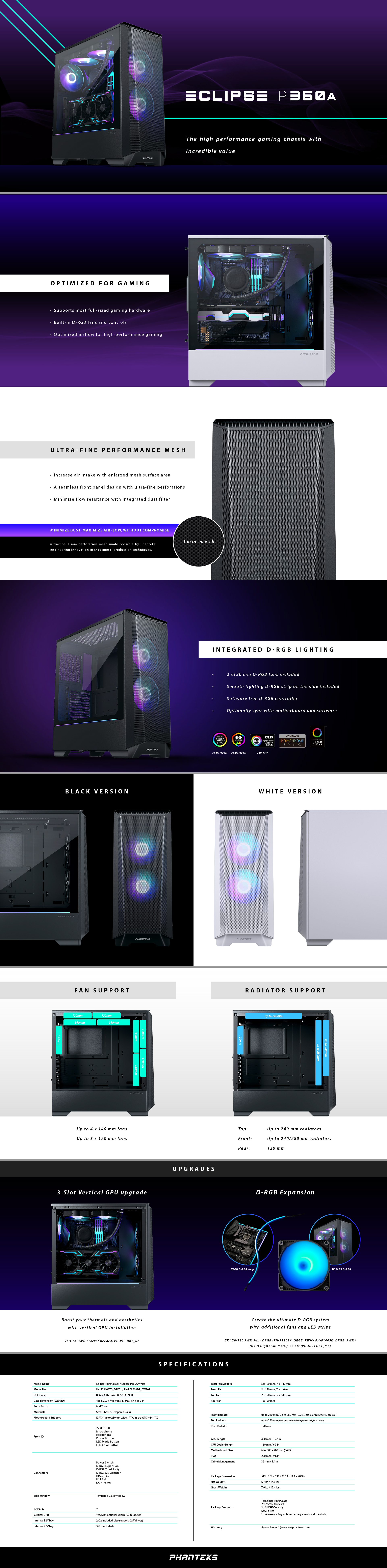 P360A具有超細密全金屬防塵面板,可帶給系統更高品質的氣流循環。Eclipse P360A的金屬前面板使用了一體成形的製作工法,加強了整體的結構與強度,同時也確保了空氣循環的穩定性;前面板上的1mm極細密網孔設計的可以提供高氣流,同時也能過濾空氣中的灰塵。在一個緊湊的ATX空間中,P360A的多功能內部結構方便您組裝系統,可安裝水冷散熱系統和高端的硬體設備。P360A內建DRGB燈光系統,可任意的調整燈光顏色和模式,隨心所欲地切換自己想要的風格!!