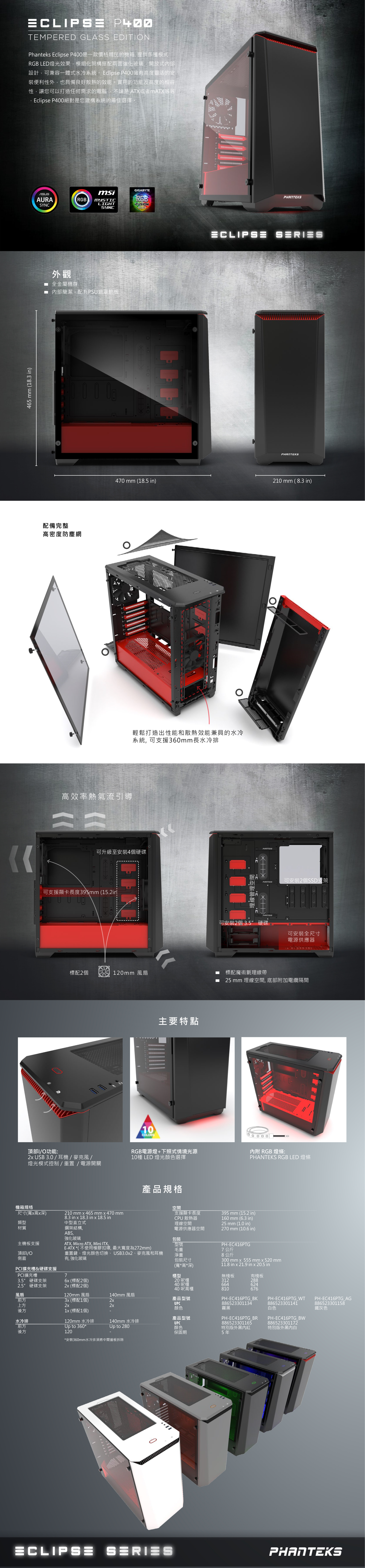 Phanteks Eclipse P400是一款價格親民的機箱. 提供多種模式RGB LED燈光效果,模組化架構搭配兩面強化玻璃,開放式內部設計,可兼容一體式水冷系統。 Eclipse P400擁有高度靈活的安裝便利性外,也具備良好散熱的效能。實用的功能及高度的相容性,讓您可以打造任何需求的電腦 ,不論是 ATX或者mATX等等,Eclipse P400絕對是您建構系統的最佳選擇。