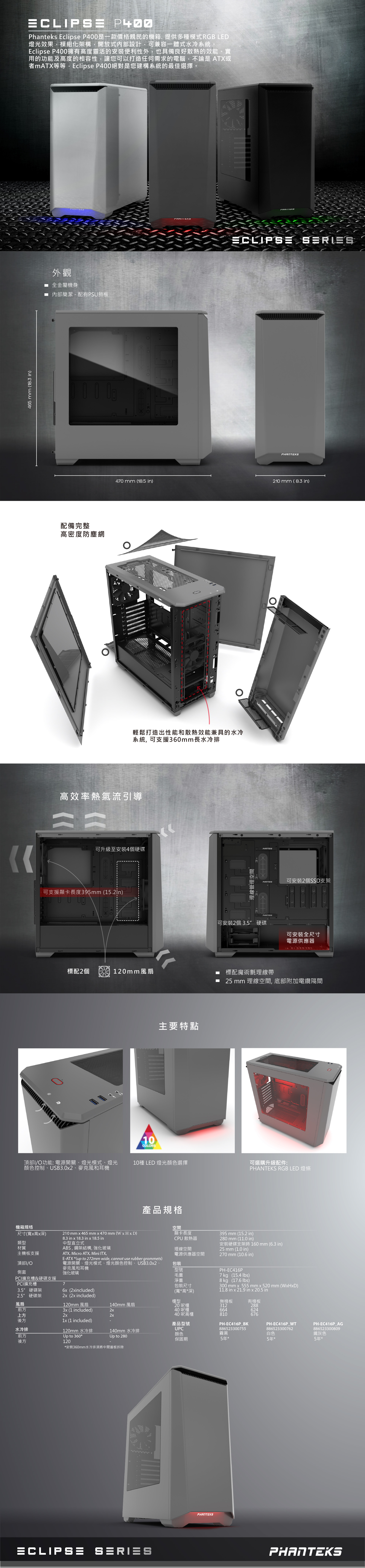 Phanteks Eclipse P400是一款價格親民的機箱. 提供多種模式RGB LED燈光效果,模組化架構,開放式內部設計,可兼容一體式水冷系統。 Eclipse P400擁有高度靈活的安裝便利性外,也具備良好散熱的效能。實用的功能及高度的相容性,讓您可以打造任何需求的電腦,不論是 ATX或者mATX等等,Eclipse P400絕對是您建構系統的最佳選擇。