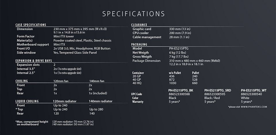 Enthoo EVOLV ITX功能強大而體積小巧,是一款以親民平價為導向的機箱,使用了鎂鋁合金外殼,並配有強化玻璃側透板。 這個機箱推出了許多創新功能,以利在ITX機箱中實現便利的安裝體驗,例如用於在頂部安裝水冷排散熱器的獨特支架解決方案以及用於水箱,馬達泵和SSD / HDD的多功能支架。 目前有黑色,黑色/紅色和白色可供選擇。