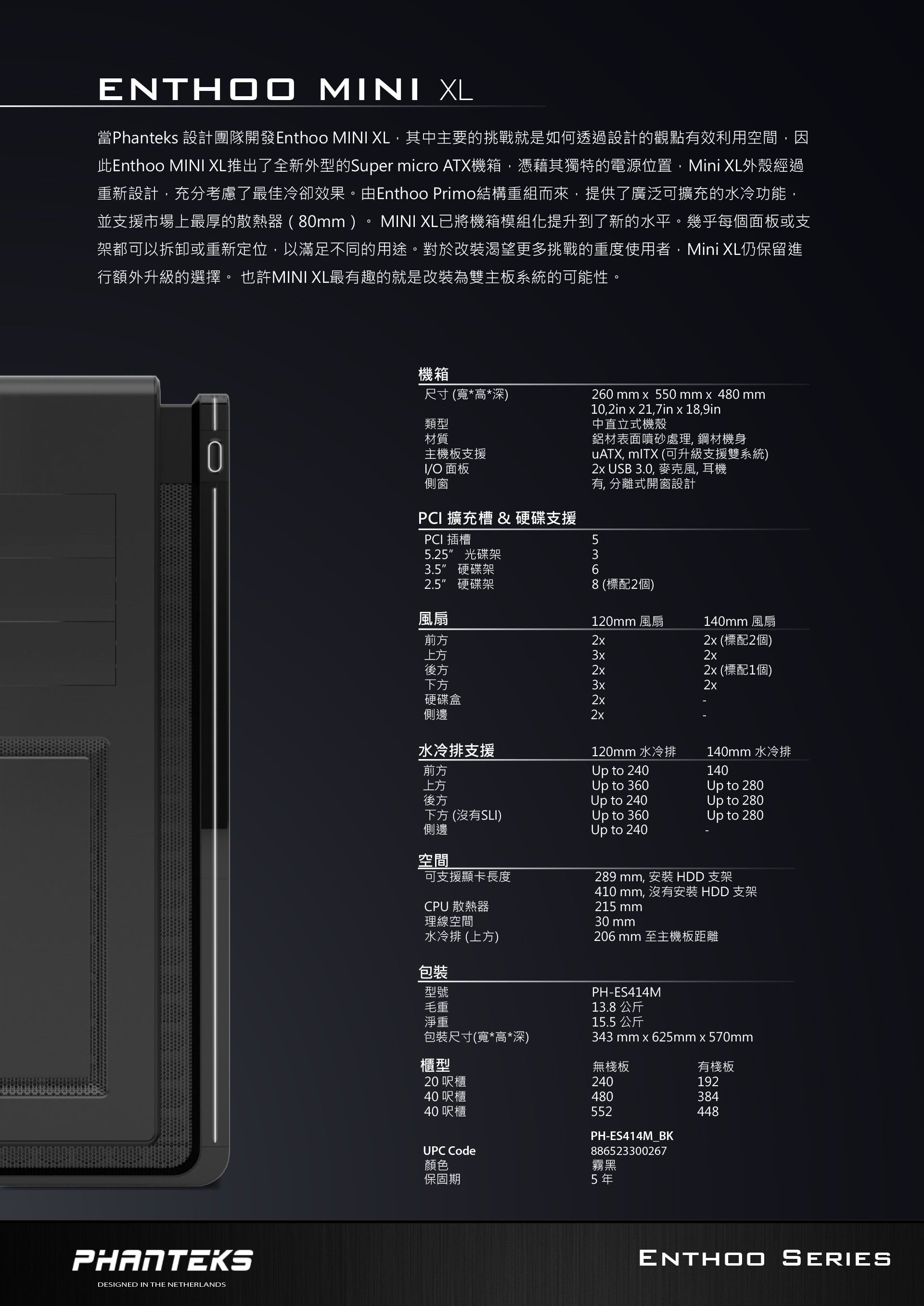 Enthoo MINI XL 推出了推出全新外型的Super micro ATX機箱, 憑藉其獨特的電源位置,Mini XL外殼經過重新設計,充分考慮了最佳冷卻效果。