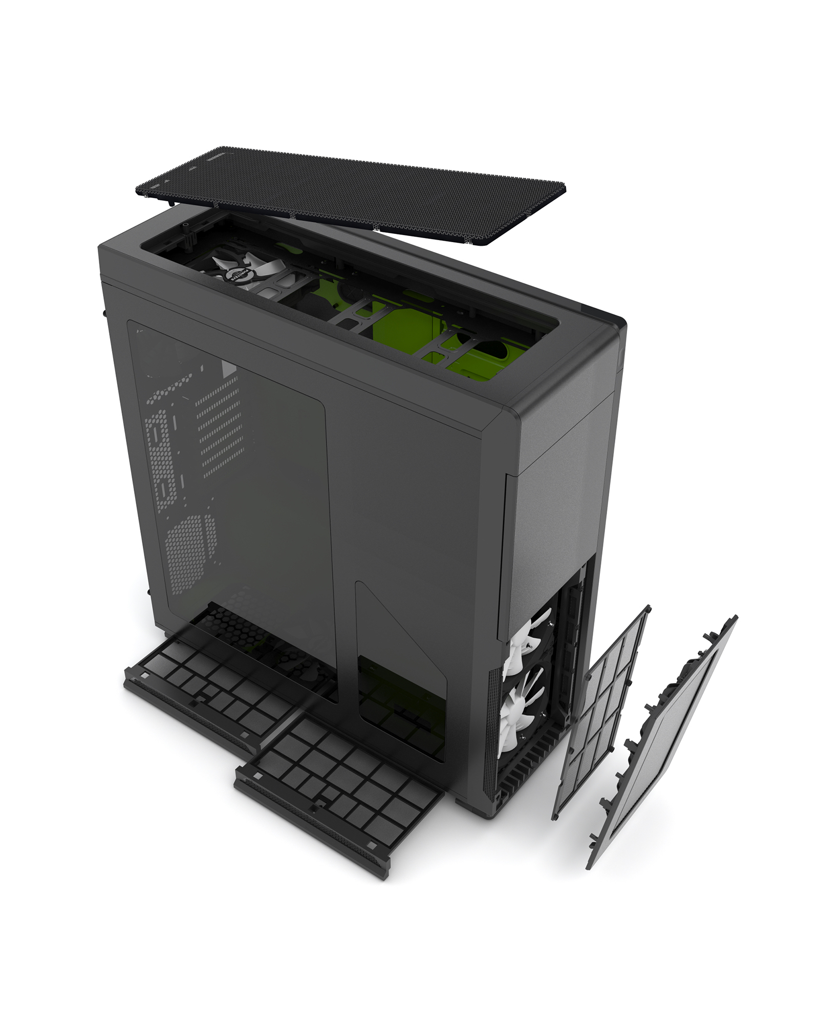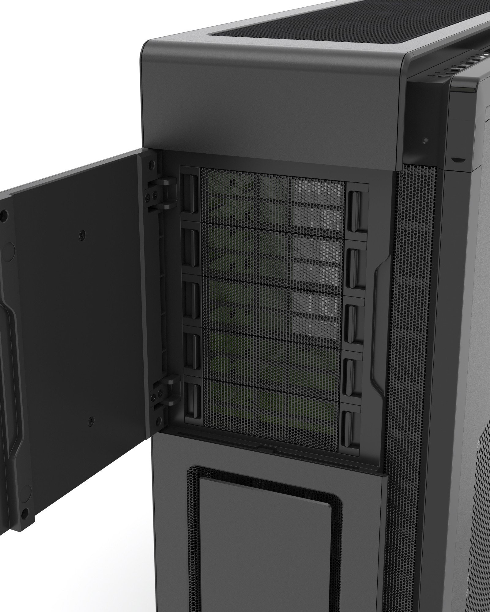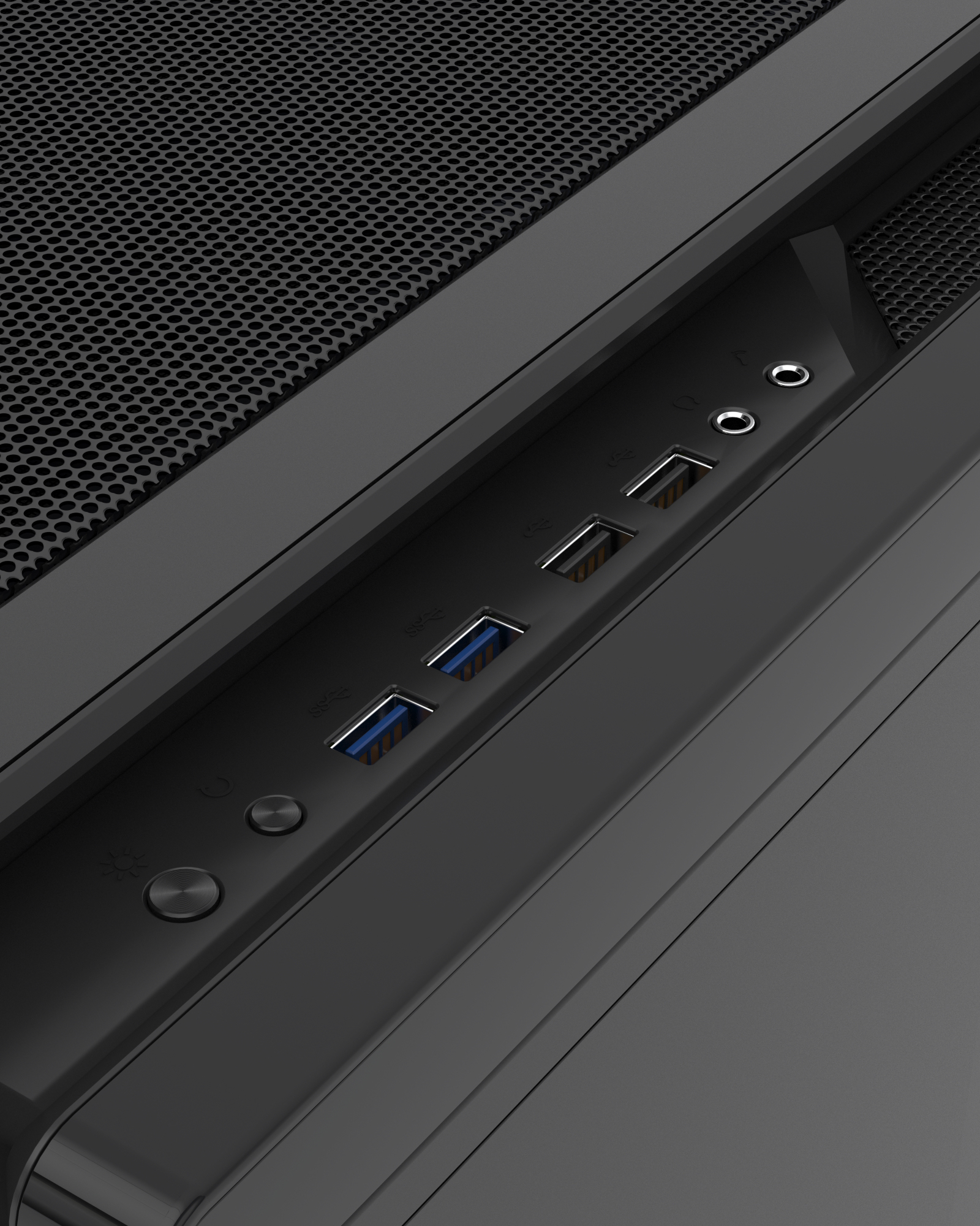 透過精湛加工的鎂鋁合金面板及蓋板更能辨識出極簡風格與高雅的設計, 可控制LED 燈效(包含燈條與LED 燈框), 拋光倒角的質感, 巧妙地突顯了進氣和排氣區域。隱藏的內裝: 隱藏式PSU/隱藏式HDD/ 線材理線遮蔽/模組化線材遮蔽.