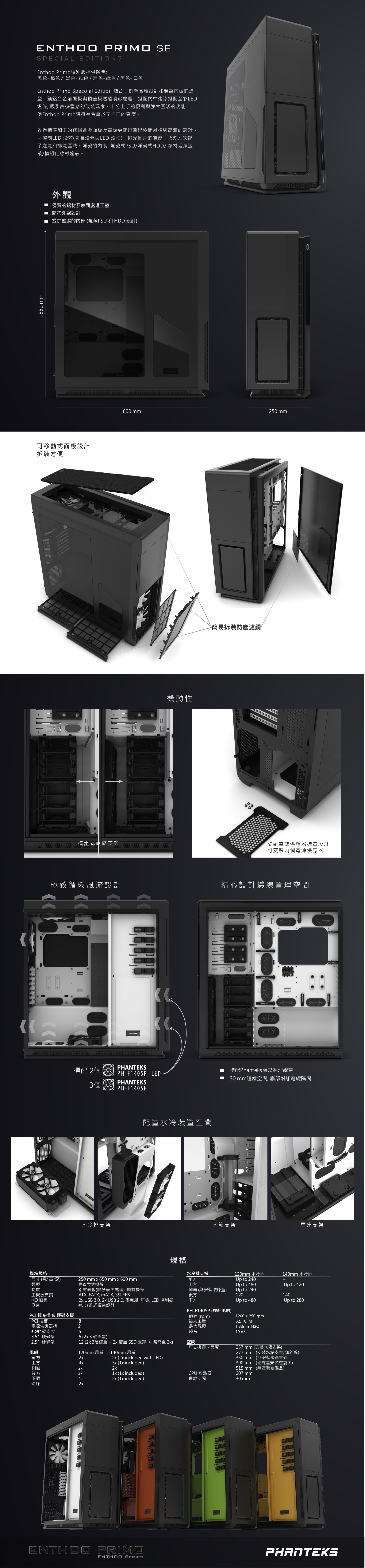 Enthoo Primo Specoial Edition 結合了創新高雅設計和豐富內涵的造型,鎂鋁合金前面板與頂蓋板透過噴砂處理, 搭配內中烤漆搭配全彩LED 燈條, 吸引許多型態的改裝玩家,十分上手的便利與強大靈活的功能, 使Enthoo Primo讓擁有者屬於了自己的高度.