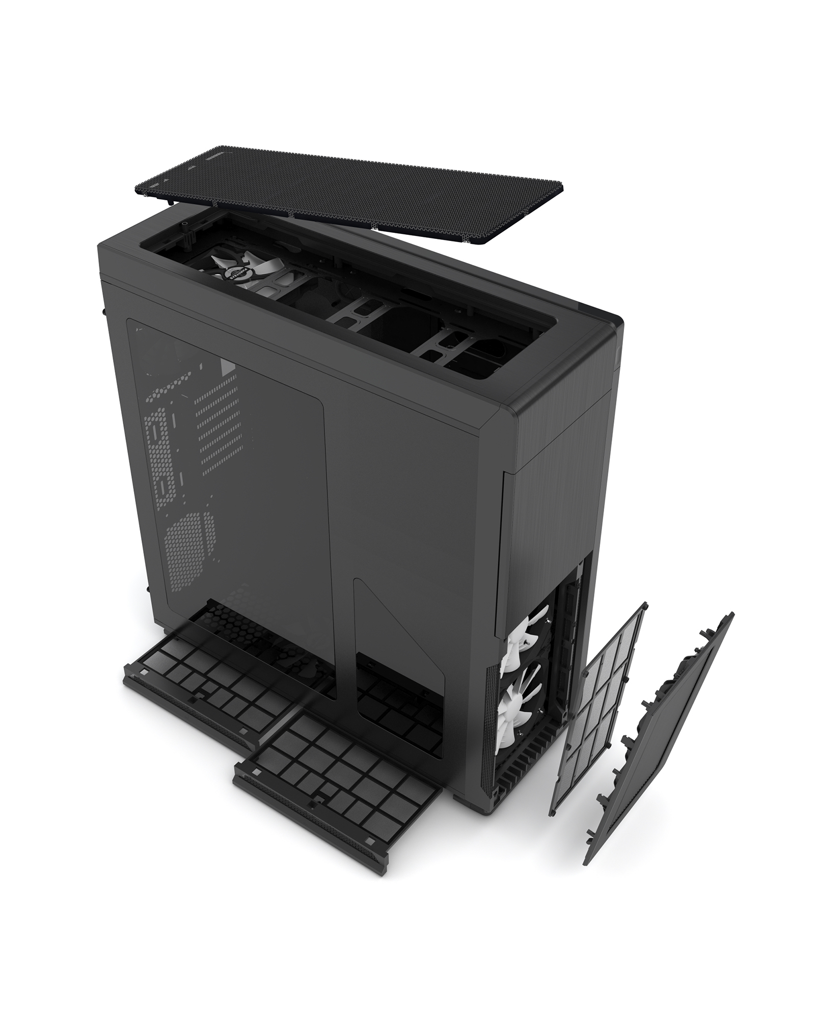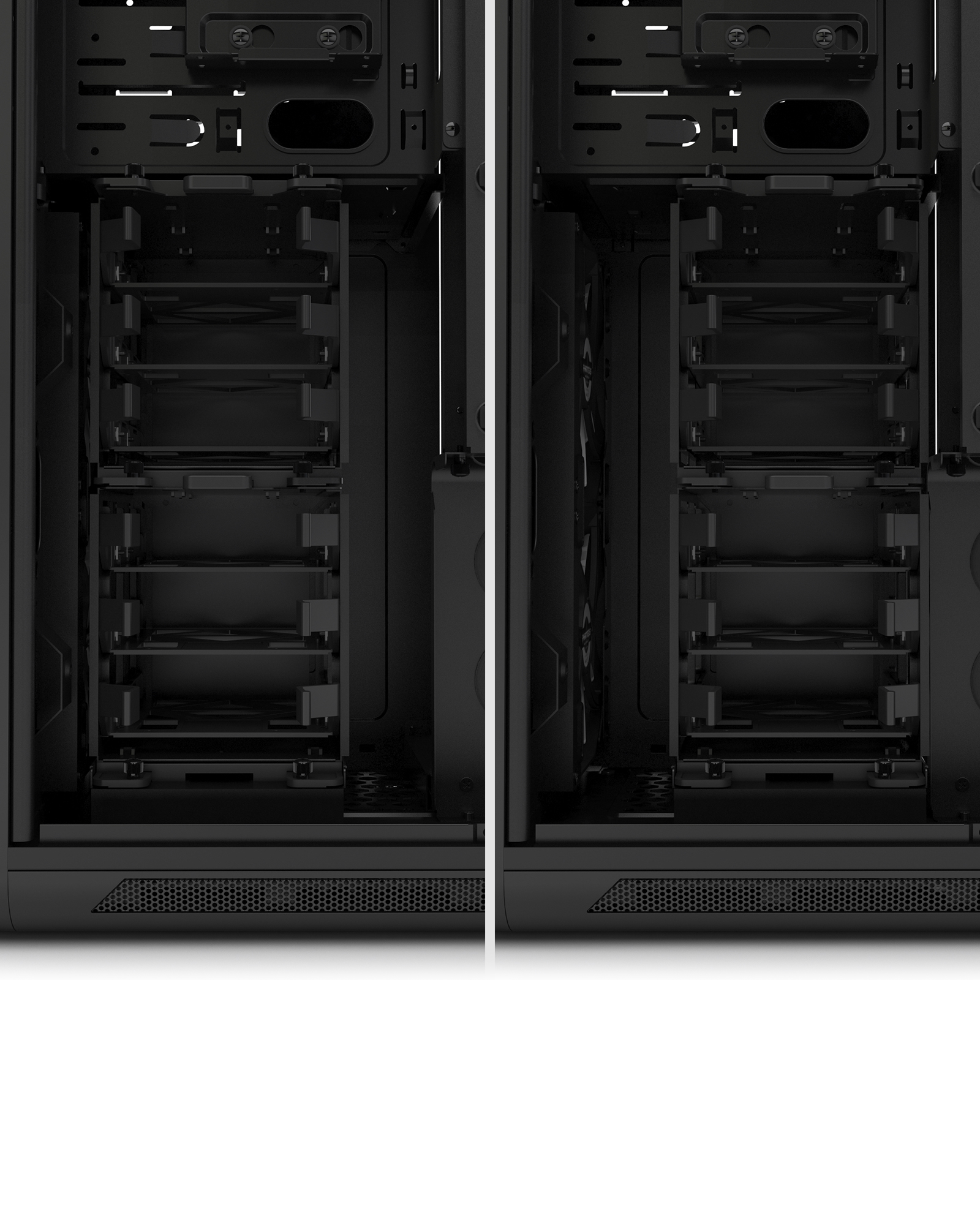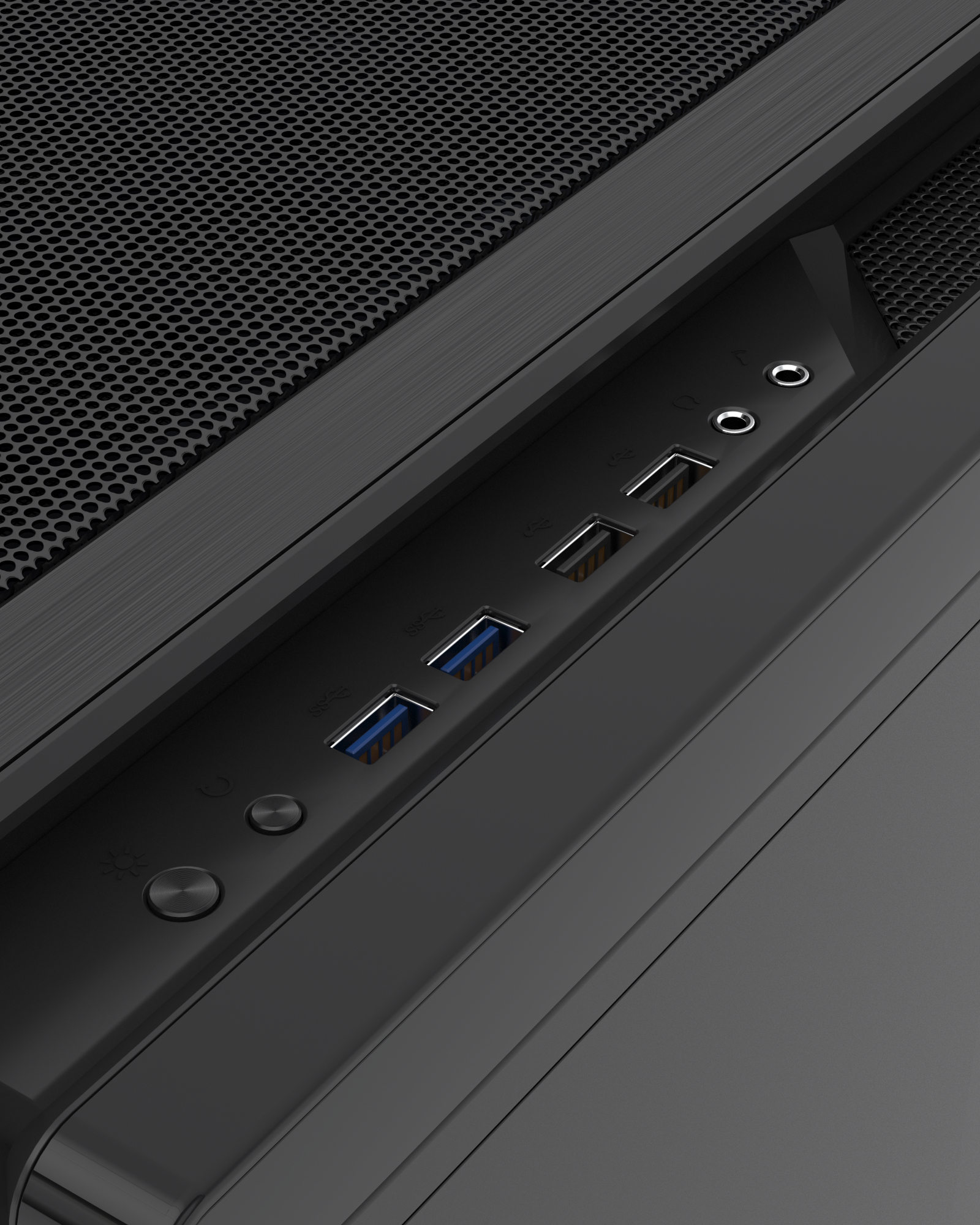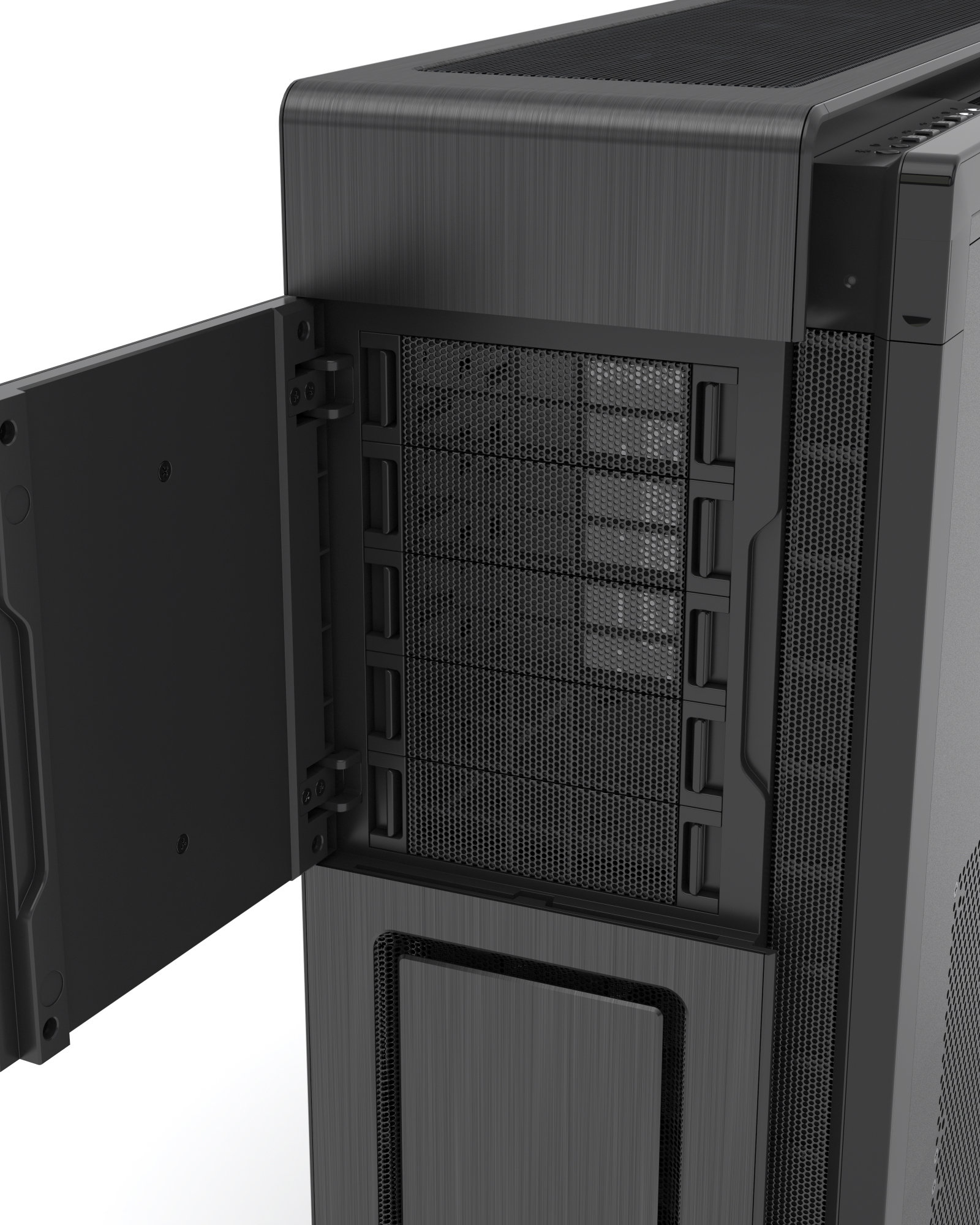 透過精湛加工的鎂鋁合金面板及蓋板更能辨識出極簡風格與高雅的設計, 可控制LED 燈效(包含燈條與LED 燈框), 拋光倒角的質感, 巧妙地突顯了進氣和排氣區域。隱藏的內裝: 隱藏式PSU/隱藏式HDD/ 線材理線遮蔽/模組化線材遮蔽.