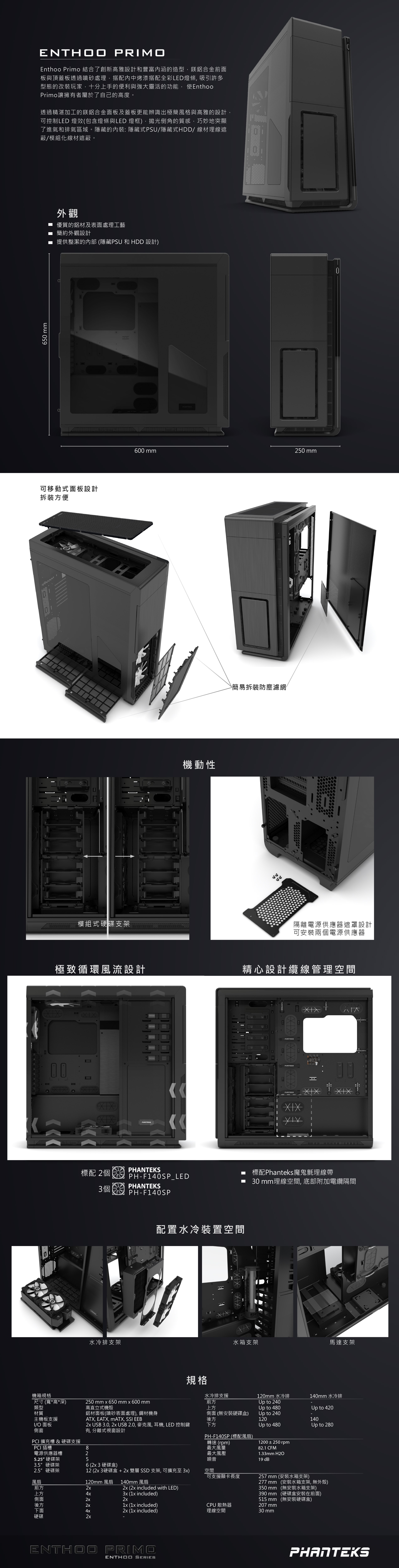 Enthoo Primo結合了創新高雅設計和豐富內涵的造型,吸引許多型態的改裝玩家,十分上手的便利與強大靈活的功能, 使Enthoo Primo讓擁有者屬於了自己的高度.