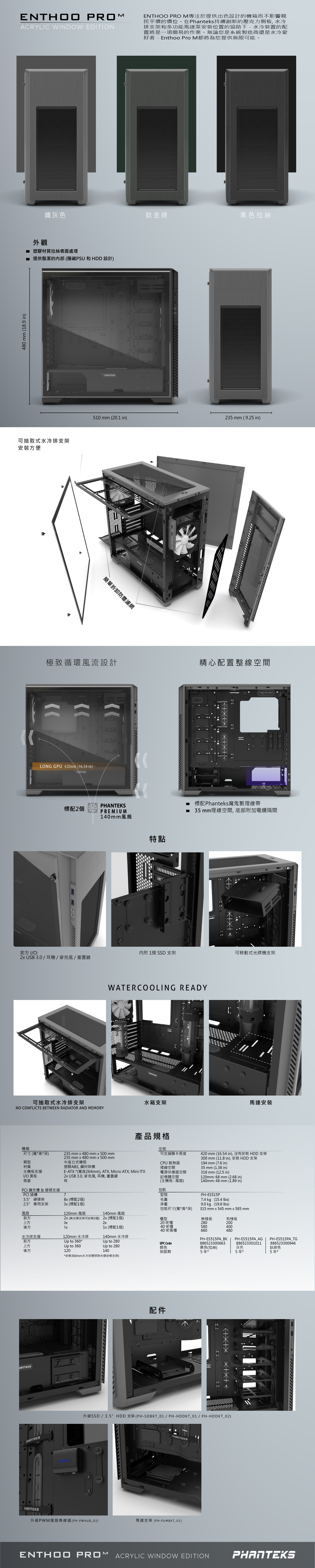 ENTHOO PRO M專注於提供出色設計的機箱而不影響親民平價的價位。在Phanteks持續創新的壓克力側板, 水冷排支架和多功能馬達泵安裝位置的協助下,水冷裝置的配置將是一項簡易的作業。無論您是系統製造商還是水冷愛好者,Enthoo Pro M都將為您提供無限可能。