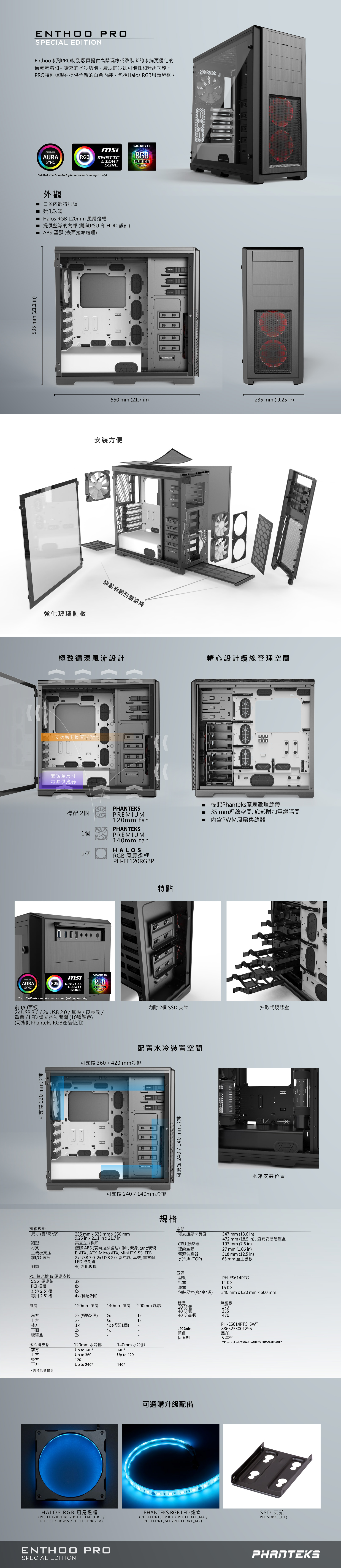 Enthoo系列PRO特別版具提供高階玩家或改裝者的系統更優化的氣流流場和可擴充的水冷功能,廣泛的冷卻可能性和升級功能。 PRO特別版現在提供全新的白色內裝,包括Halos RGB風扇燈框。