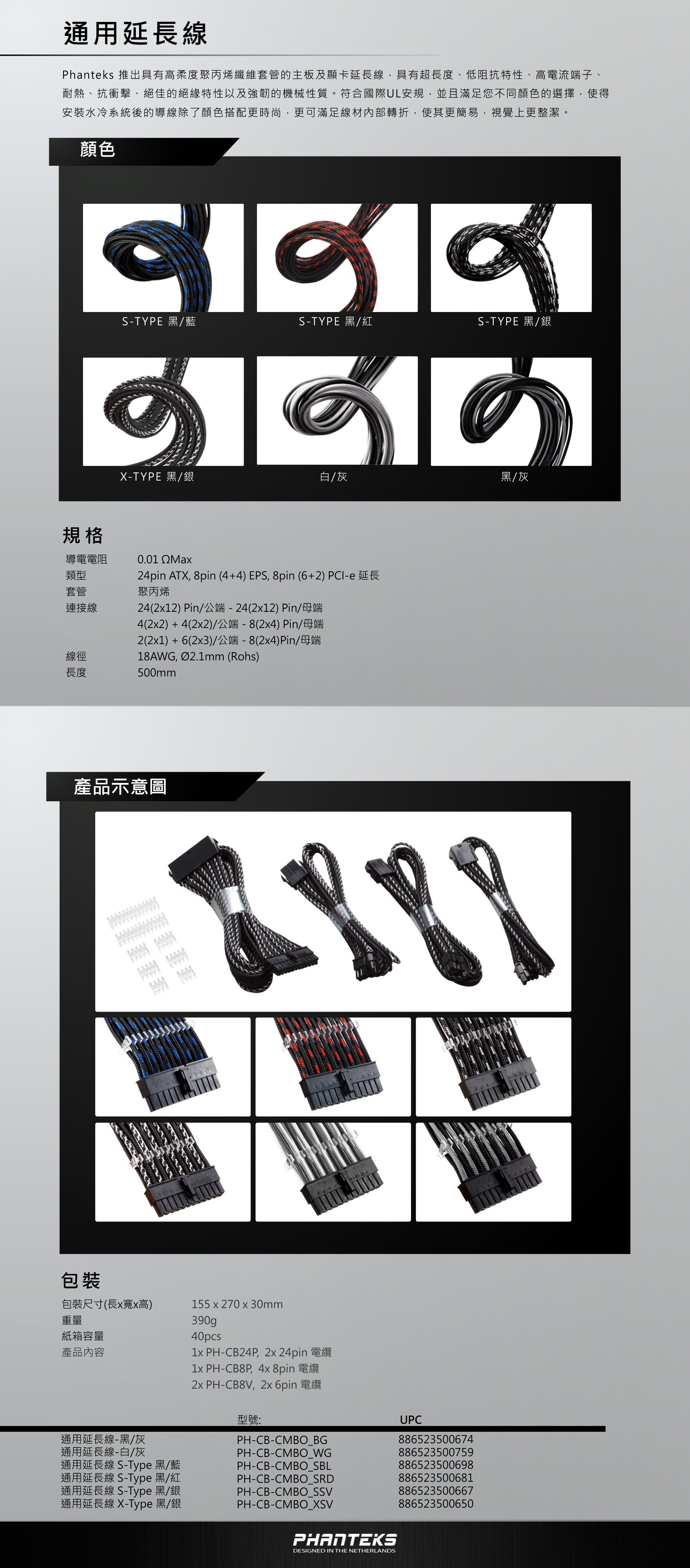 Phanteks 推出具有高柔度聚丙烯纖維套管得主板及顯卡延長線, 具有超長度, 低阻抗特性, 高電流端子, 耐熱, 抗衝擊, 絕佳的絕緣特性, 機械性質強韌 符合國際UL安規, 並且滿足不同顏色選擇, 使得安裝水冷系統後的導線除了顏色搭配更時尚, 更可滿足線材內部轉折, 使其更簡易視覺上更整潔.