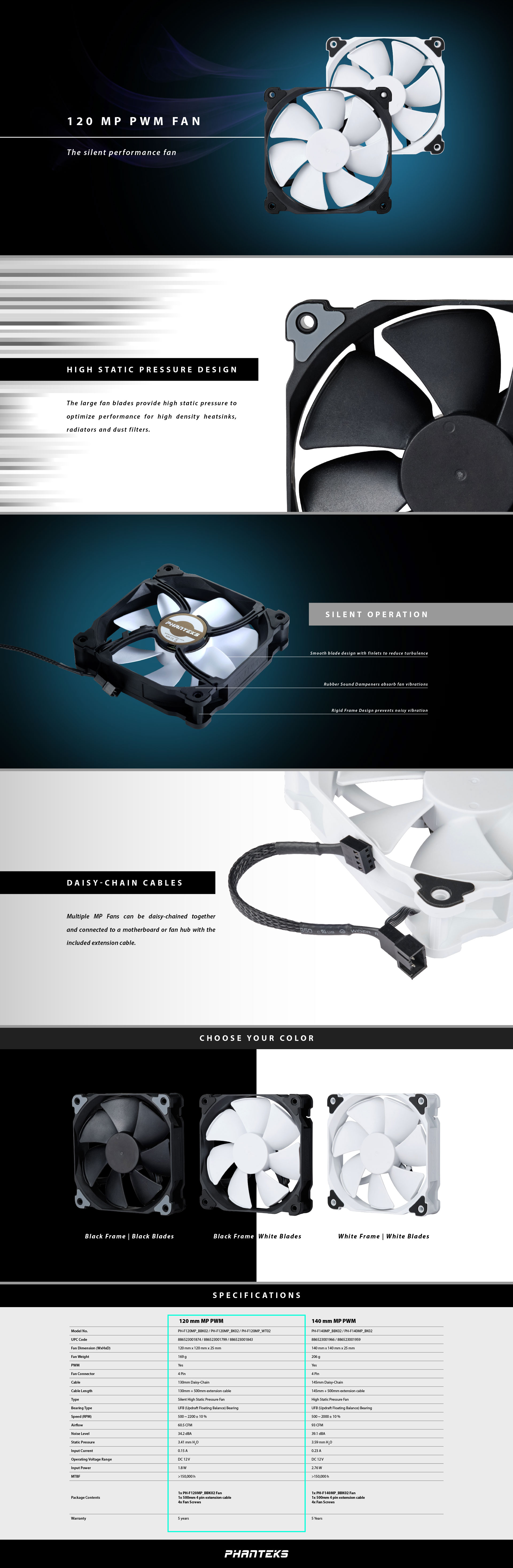 PH-F120MP是Phanteks的120mm高風壓風扇,採用獨特的Maelström概念技術設計。 PH-F120MP 內建PWM風扇轉速設於500-2200rpm之間, 應用於高轉速效能模式與低轉速靜音模式的調整。