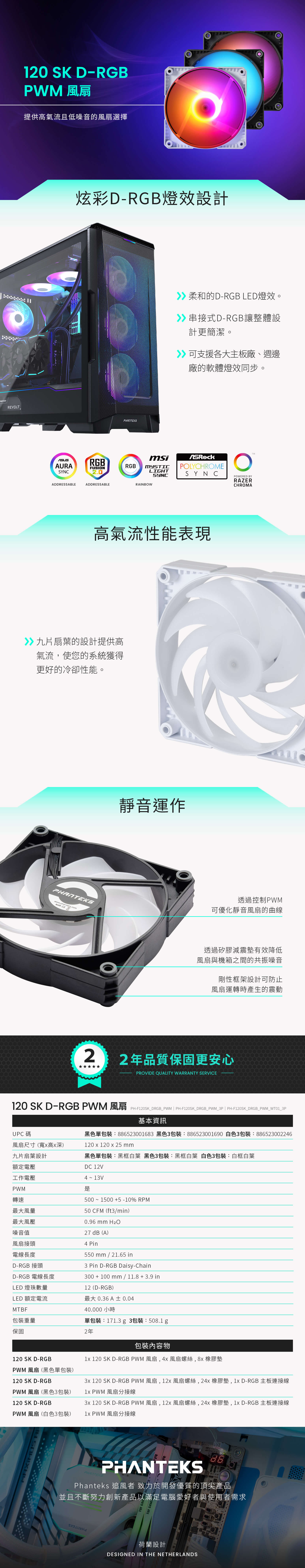 SK系列風扇採用9片葉的扇葉設計,為您提供高氣流且低噪音的選擇。透過PWM的訊號控制,讓您準確地掌握每一段風扇轉速,而厚實的扇框設計可以避免運轉時所產生的振動。除此之外,SK風扇也結合了LED燈光展示效果(僅適用於RGB和DRGB型號)。