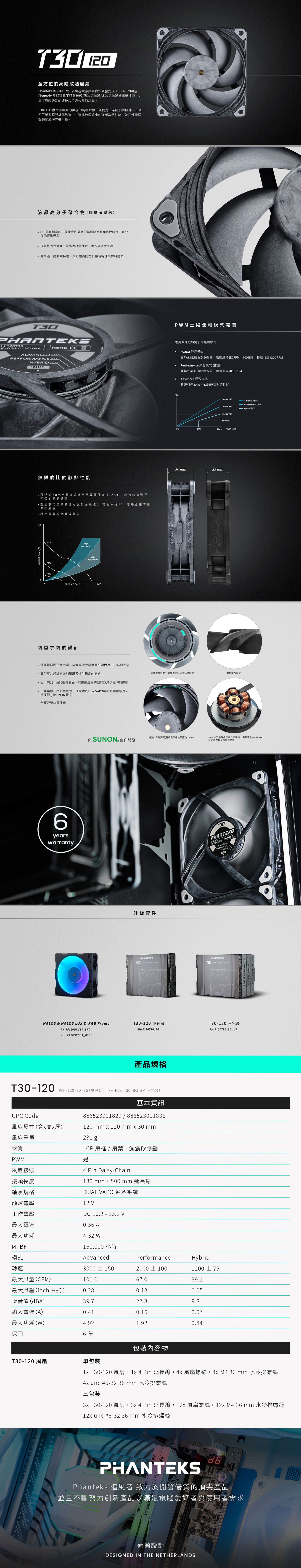 Phanteks與SUNON知名風扇大廠共同合作開發T30-120,經由多年研發以及嚴格的測試,T30-120風扇在不同需求下,展現無與倫比的強力散熱性能。此外,T30-120結合最新的工程創新和工業級LCP材料所製,可達到前所未有的散熱性能與音質效果。T30-120內建隱藏式三段可調風扇控制器,具備各種可調變的轉速範圍滿足使用者不同的對應需求,分別是安靜/平衡與極致性能。