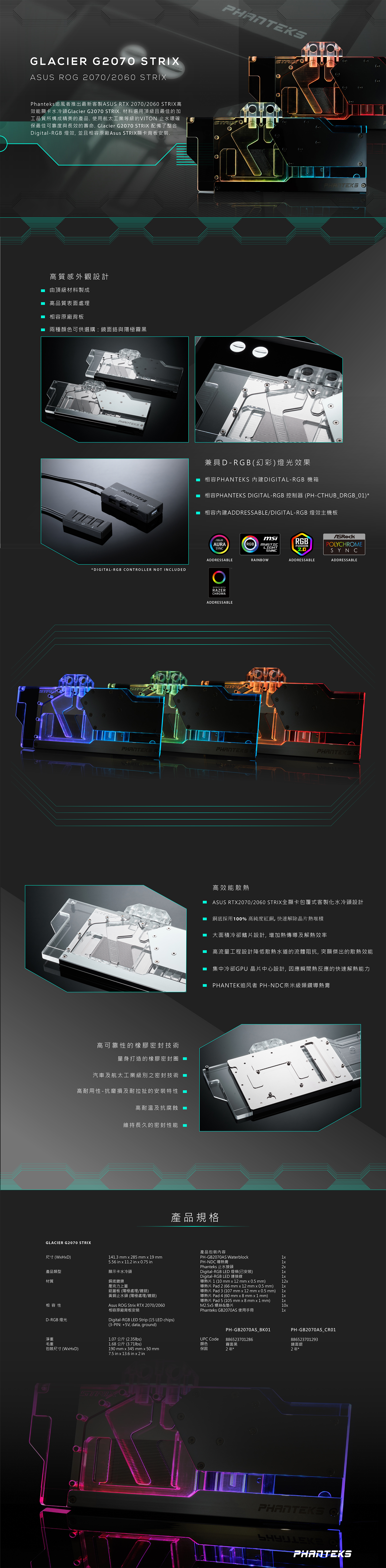 Phanteks追風者推出最新客製 Asus RTX 2070/2060 Strix 高效能顯卡水冷頭 Glacier G2070 Strix。 材料選用頂級且最佳的加工品質所構成精美的產品. 使用航太工業等級的VITON 止水環確保最佳可靠度與長效的壽命. Glacier G2070 Strix 配備了整合Digital-RGB 燈效, 並且相容原廠 Asus RTX 2070/2060 Strix 顯卡背板的安裝。