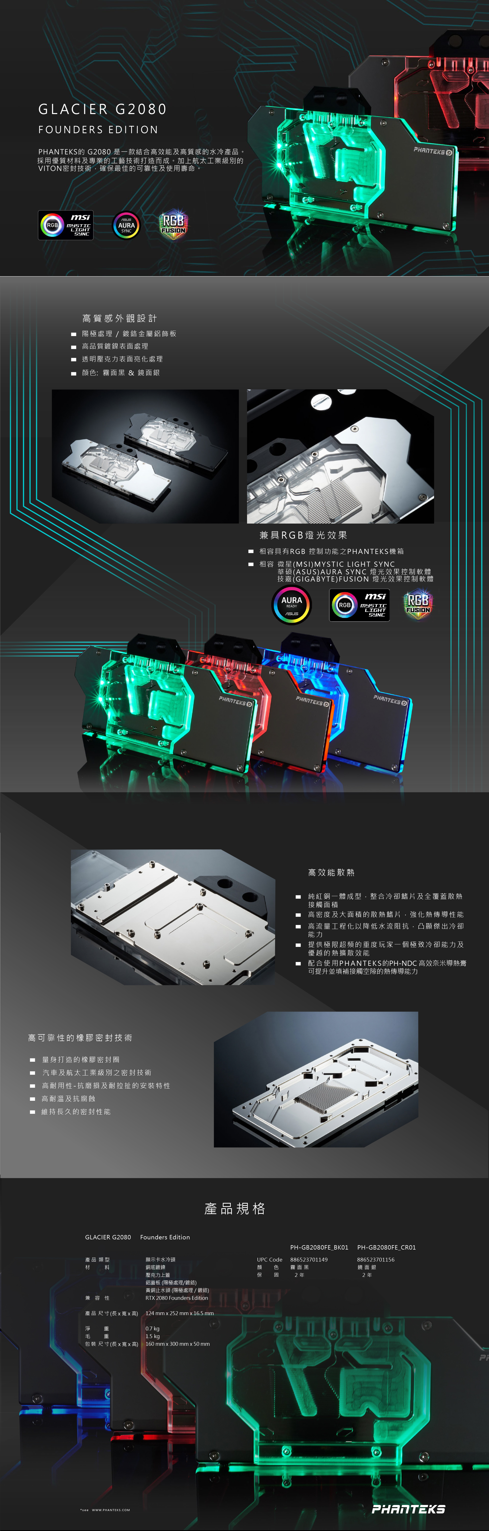 Phanteks GLACIER 冰川系列G2080顯卡水冷頭, 是針對玩家和改裝者設計的高性能水冷產品。 採用優質材料製成,符合Phanteks最極致精湛的工藝標準。 源自賽車工業和航太工業的杜邦專利VITON材料- 氟素橡膠, 訂製密封水冷環以確保最佳的可靠性和使用壽命。