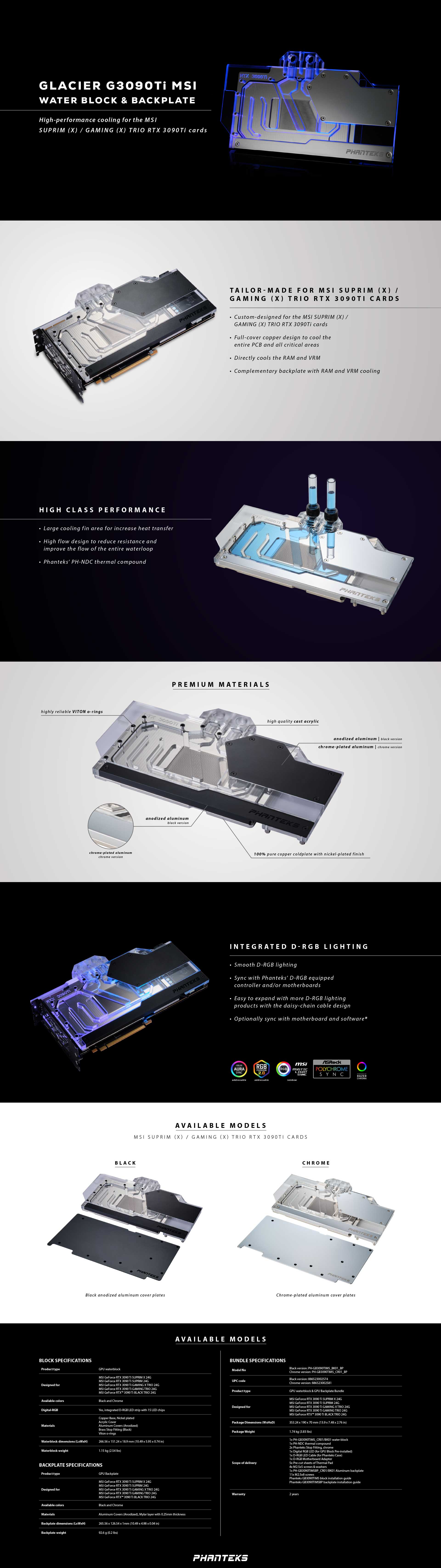 3090 Ti 是 GeForce RTX 30 系列中最強大的顯卡,新推出的 Glacier G3090 Ti MSI 水冷頭可提供出色的冷卻效果並實現頂級性能。隨著新RTX 3090 Ti 設計上增加的功耗和前置內存核心,Glacier G3090 Ti 顯卡水冷頭帶給您前所未有的散熱效果。與所有Glacier水冷頭一樣,水冷頭使用了優質原料,例如鏡面鋁合金蓋板、高熱傳導的紅銅基底以及高透光的優質壓克力。另外,密封部分則使用航太等級的VITON密封圈,確保產品的穩定性以及提升產品的使用年限。G3090 Ti MSI水冷頭也結合D-RGB燈效,帶給您極致燈光效果體驗。此外,也可以搭配Phanteks其他D-RGB產品或是第三方的A-RGB產品,讓整體配備有一致性並達到最佳的視覺效果。最後,推薦您G3090 Ti ASUS顯卡背板,此款鋁合金背板使用CNC加工所製成,有霧面黑和鏡面銀兩種表面可供選擇。顯卡背板可完全覆蓋PCB,內附的散熱貼片使PCB背板上之RAM和VRM達到降溫效果。此設計不僅讓外型典雅美觀,同時讓散熱性能極大化。Glacier G3090 Ti MSI 水冷頭套組提供霧面黑和鏡面銀兩種顏色供您選擇。