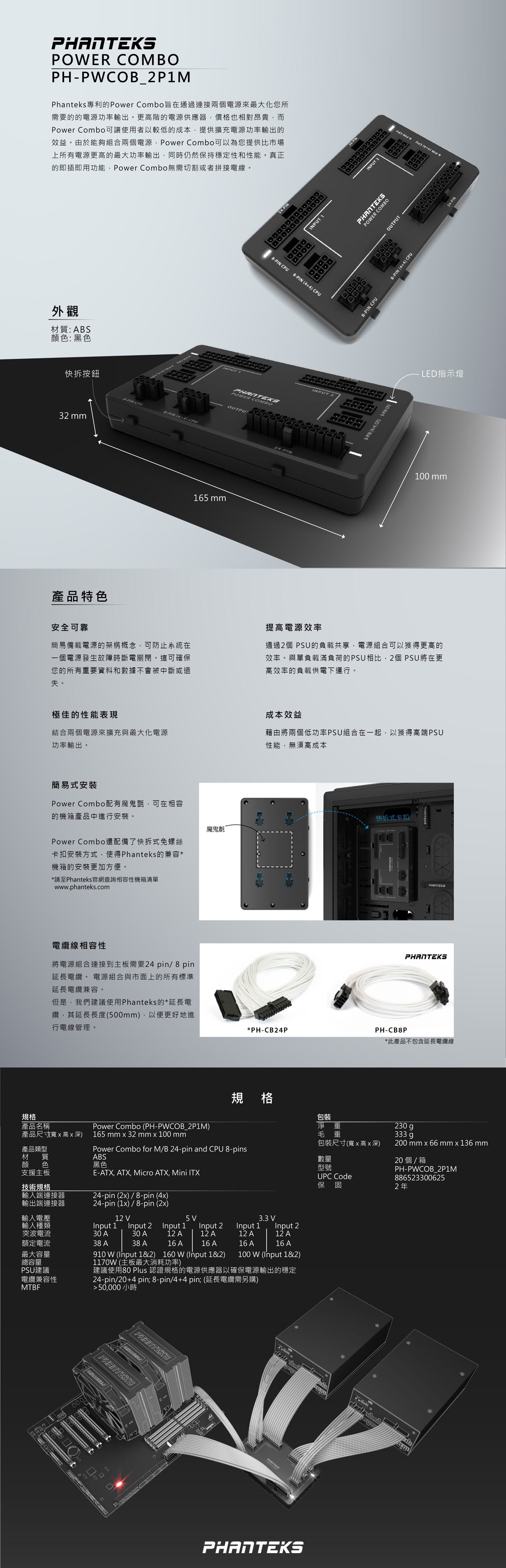Phanteks專利的Power Combo旨在通過連接兩個電源來最大化您所需要的的電源功率輸出。 更高階的電源供應器, 價格也相對昂貴,而Power Combo可讓使用者以較低的成本,提供擴充電源功率輸出的效益。 由於能夠組合兩個電源,Power Combo可以為您提供比市場上所有電源更高的最大功率輸出,同時仍然保持穩定性和性能。 真正的即插即用功能,Power Combo無需切割或者拼接電線。