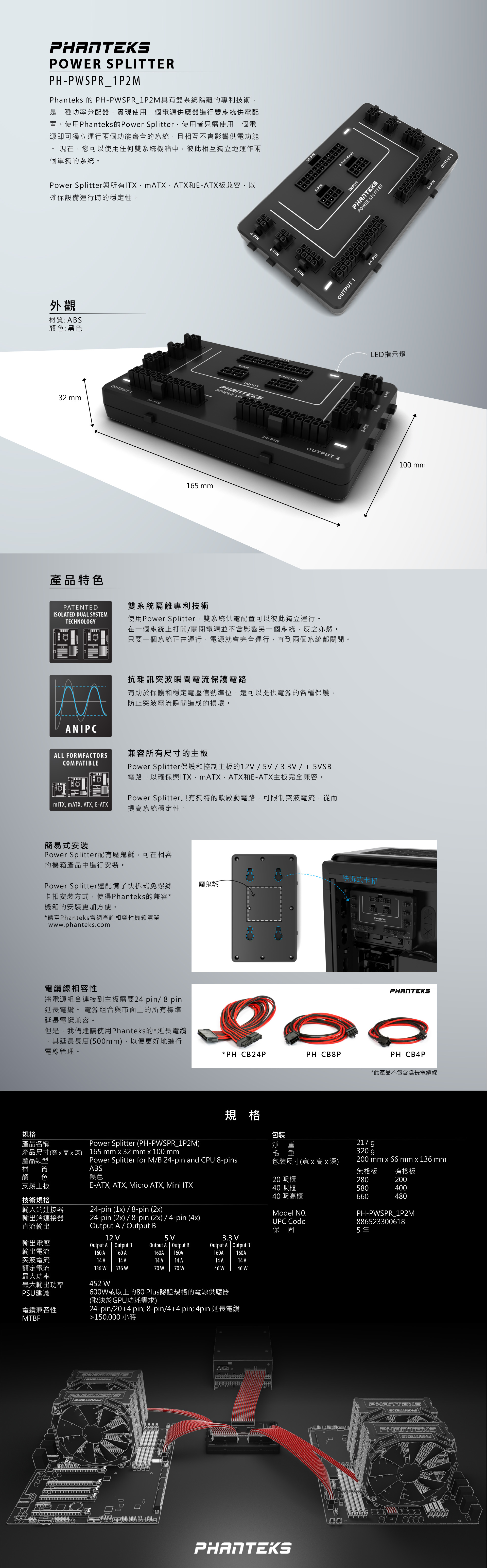 PhanteksPH-PWSPR_1P2M具有雙系統隔離的專利技術,是一種功率分配器,實現使用一個電源供應器進行雙系統供電配置。 使用Phanteks的Power Splitter,使用者只需使用一個電源即可獨立運行兩個功能齊全的系統, 且相互不會影響供電功能。 現在,您可以使用任何雙系統機箱中, 彼此相互獨立地運作兩個單獨的系統。 Power Splitter具有成本效益,佔地面積小,不佔用寶貴的空間。