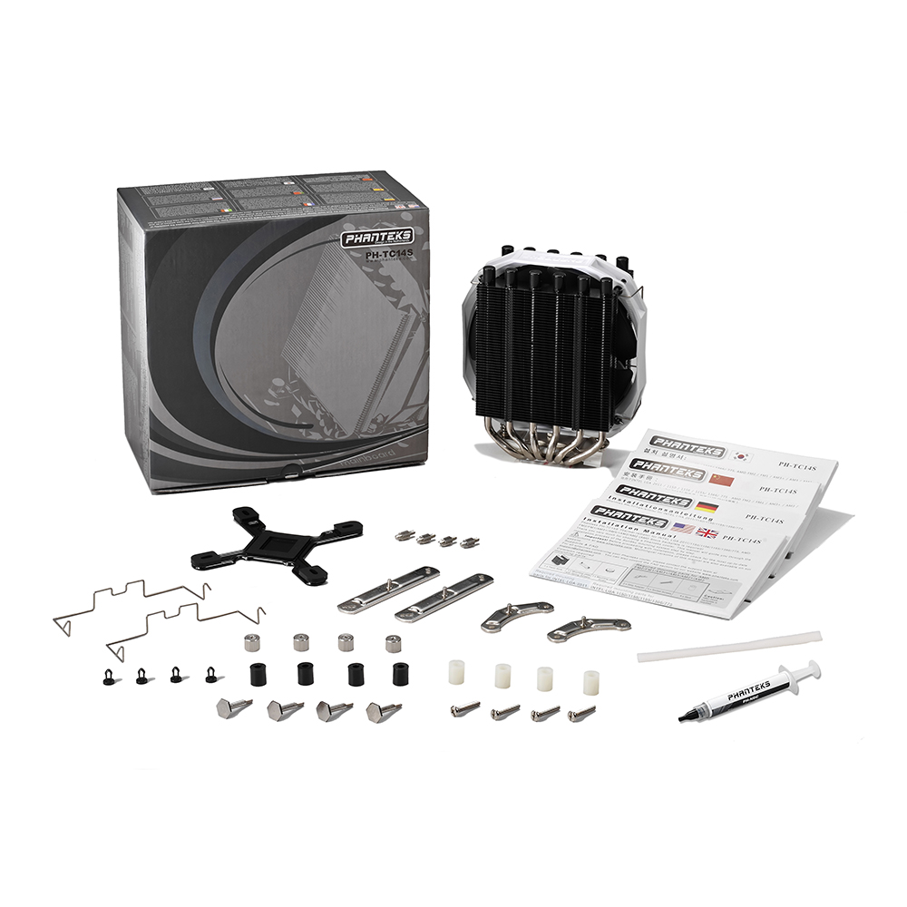 1x PH-TC14S 1x PH-F140HP PWM Premium Fan 1x SoliSku Mounting kit for Intel and AMD(Stock backplate required) 1x PH-NDC Thermal Compound 1x Phanteks PH-TC14S User’s Manual 4x Rubber Bar 4x Fan Clips |