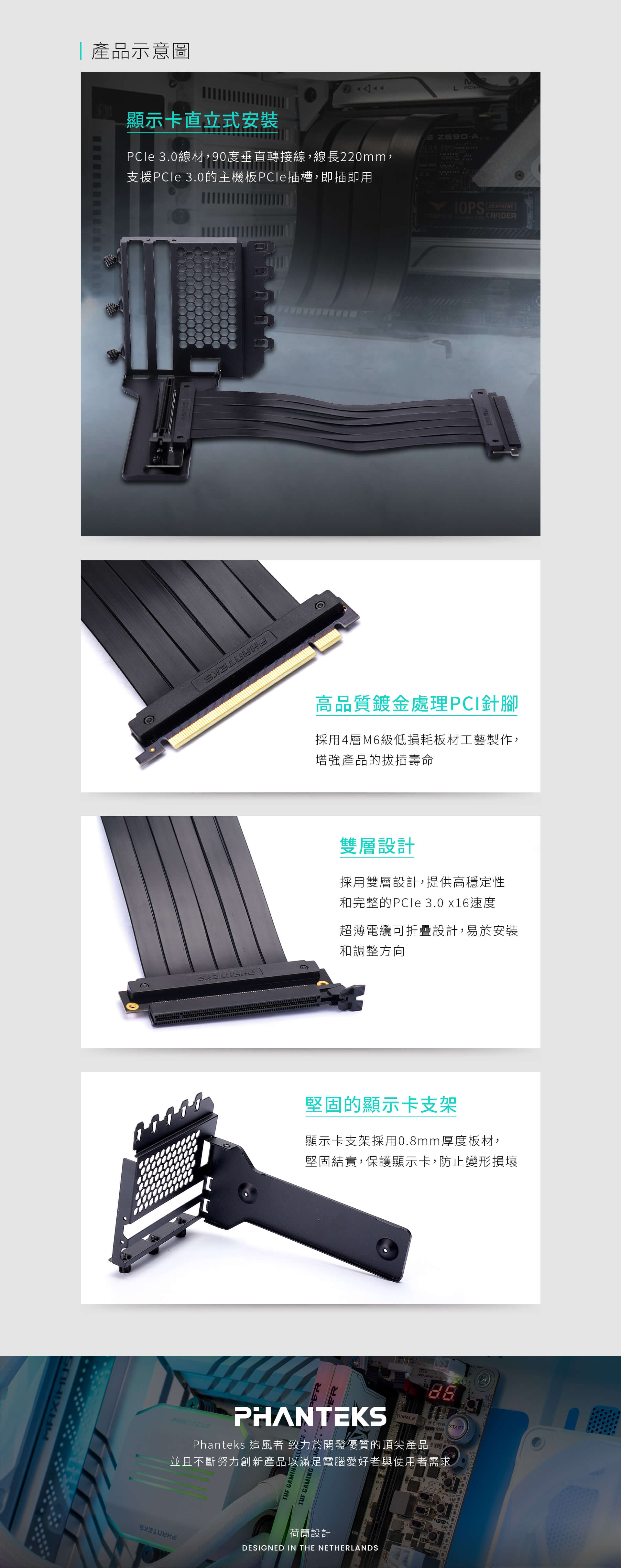 Phanteks 直立式 GPU顯卡安裝套件, 可讓用戶在其外殼中垂直的安裝顯示卡。 該套件包括22公分PCIE延長線和通用型支架。