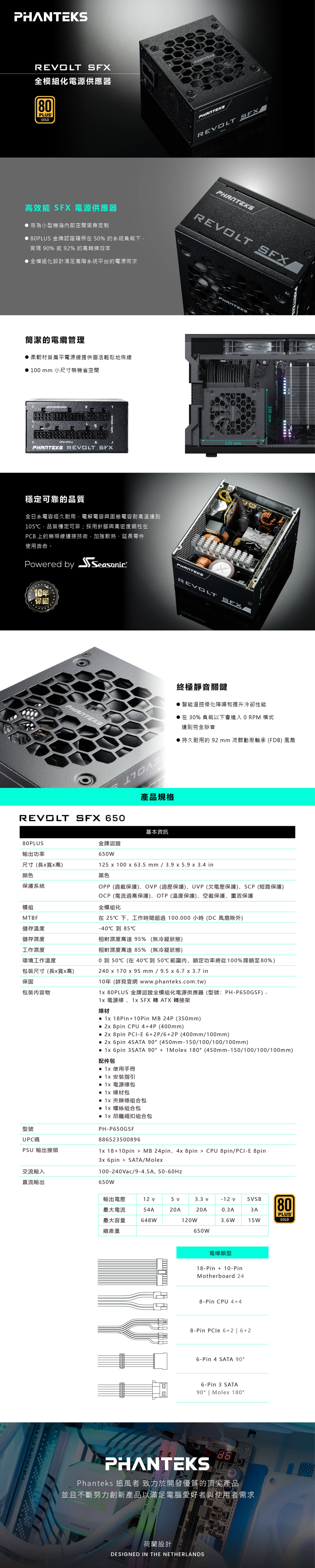 Phanteks Revolt SFX 電源將強大的 Revolt 系列帶入更小的機箱空間。Revolt SFX電源供應器小巧的外觀乘載著強大的功能,既可安裝在小型iTX機殼,亦可安裝在較大機殼,提供用戶簡潔的電纜管理。高效能80 PLUS金牌認證確保在50%的系統負載下實現 90% 的效率,Revolt SFX電源供應器與知名電源開發製造商Seasonic共同開發,保證最佳的耐用性和穩定性。 Revolt SFX電源供應器配備92mm流體動壓軸承(FDB) 風扇,具有智能熱控制功能,可優化降噪和冷卻性能。具有 0 RPM 模式,同時在 30% 負載下實現終極靜音。憑藉超小巧的SFX外形和高功率輸出,Revolt SFX 是小型機箱的完美搭配。僅 100 mm的長度可騰出空間,方便用戶電纜管理,改善整體建構過程。全模組化在安裝過程中提供完全的靈活性和易用性。全黑扁平帶狀電纜非常靈活,長度均考慮到小型機箱的設計,有助於在狹小空間內更輕鬆地佈線。