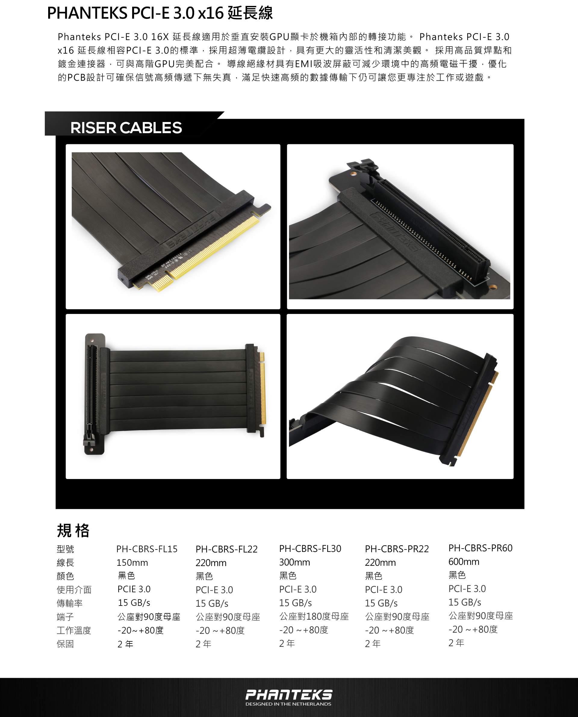Phanteks 顯卡延長線非常適合垂直安裝GPU顯卡於機箱內部的轉接功能。 轉接線提升電纜線相容PCI-E 3.0的標準,採用超薄電纜設計,具有更大的靈活性和清潔美觀。 採用高品質焊點和鍍金連接器,可與高階GPU完美配合。 導線絕緣材具有EMI吸波屏蔽可減少環境中的高頻電磁干擾,優化的PCB設計可確保信號高頻傳遞下無失真,滿足快速高頻的數據傳輸下仍可讓您更專注於工作或遊戲。