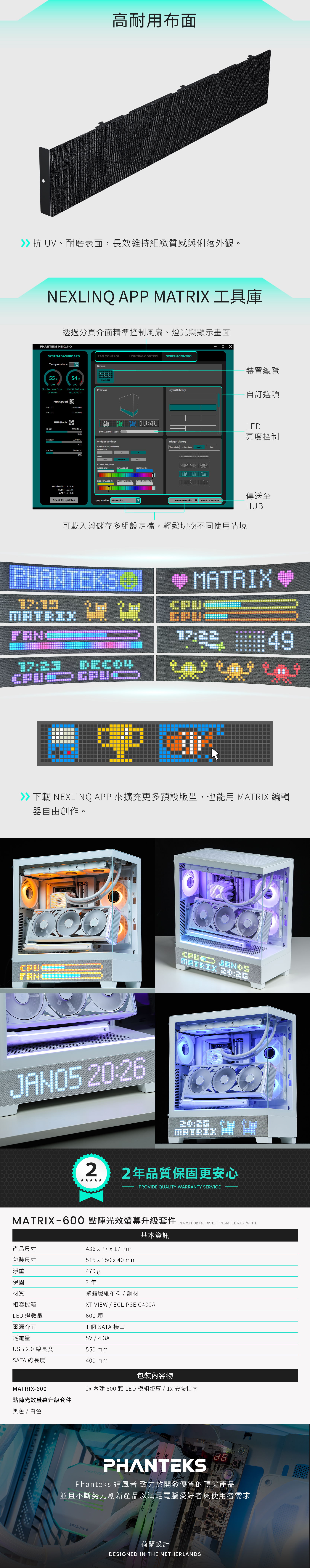 MATRIX-600 點陣光效螢幕升級套件讓 XT View、Eclipse G400A 等相容機殼輕鬆升級完整 Matrix 顯示體驗。600 顆 LED 隱於抗 UV、耐磨織布後,系統資訊、時間日期與自訂動畫清晰呈現,搭配輕量 Nexlinq App 與專屬硬體,CPU 負擔更低。