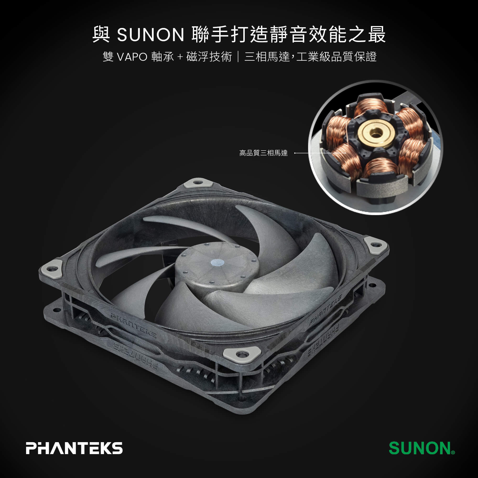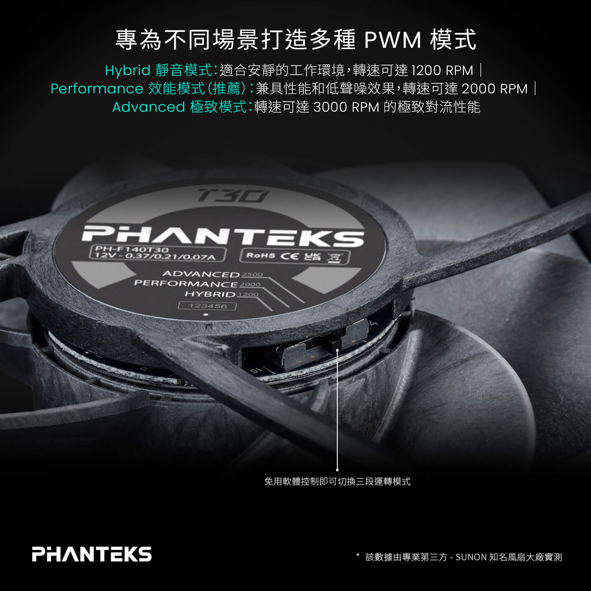 Phanteks 與知名風扇大廠 SUNON 攜手打造 T30 風扇。憑藉多年在機殼、風冷、水冷散熱等專業技術的研發經驗,Phanteks 完成了旗艦級的終極全方位散熱風扇。