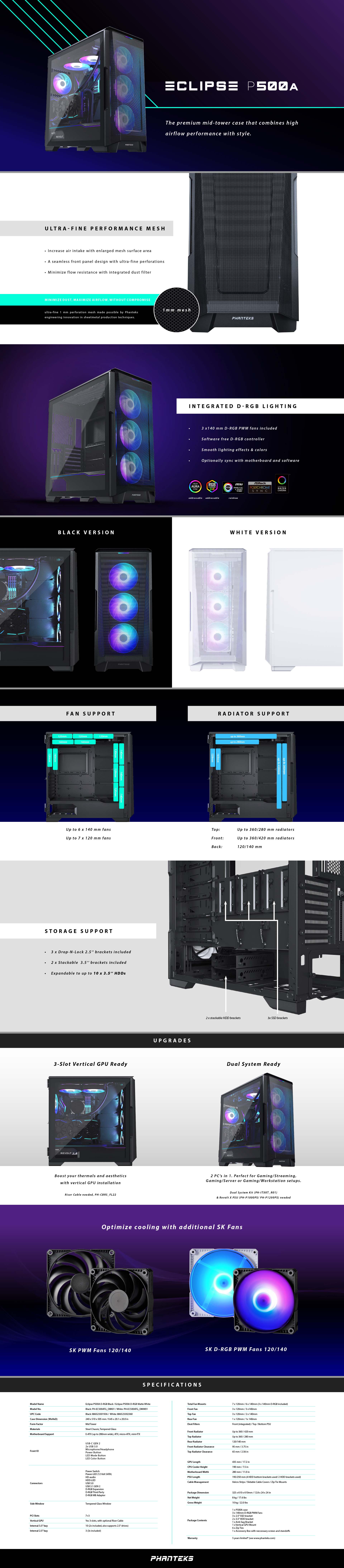 P500A的設計基礎來自於優秀的Eclipse系列,P500A 不僅運用了該系列的傑出設計理念,也將此機殼的氣流循環提升至最高。這款機殼設計的特別之處,就是它的前面網結構:此面網結構不但一體成形,還有無數的網孔來減少氣流的阻抗,同時也加強了氣流的循環;側板採用可掀式的鋼化玻璃側板,讓您可以清楚地看見電腦硬體的科技美,可掀式的設計也讓您在進行清潔和安裝時更加便捷。出色的P500A還有一些特色功能,像是可支援雙平台系統的架設(需要PH-ITXKT_R01和Revolt X支援)、高透氣性、水冷式散熱模組安裝,以及其強大的高擴充性(最高可支援10顆HDD硬碟和3顆SSD硬碟),內建D-RGB控制器可隨意選擇呈現出您想要的燈光效果。
