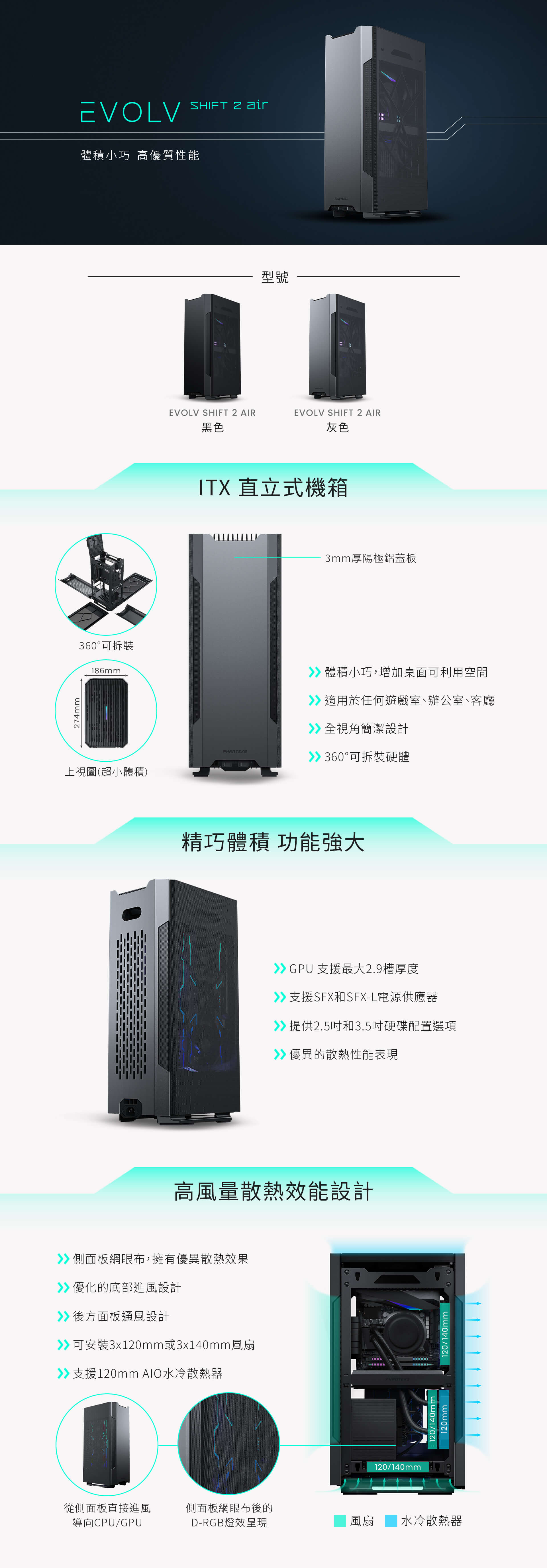 Evolv Shift 2和Shift 2 Air為 iTX 直立式機殼,Evolv Shift 2 (Air)具有面積較小的底座,在空間使用上發揮到極大的效益,其設計概念來自於有著獨特外型的Evolv Shift;D-RGB燈光以巧妙且時尚的形式結合在機殼上,此外主板上的I/O也都被隱藏起來,只要輕按頂部的開關,即可開啟使用。Evolv Shift 2的氣流循環是靠著透氣的蓋板、底座及後面板所運作,使得Evolv Shift 2具備著頂級遊戲系統的可能性! 高效能的顯示卡可支援到2.9插槽。