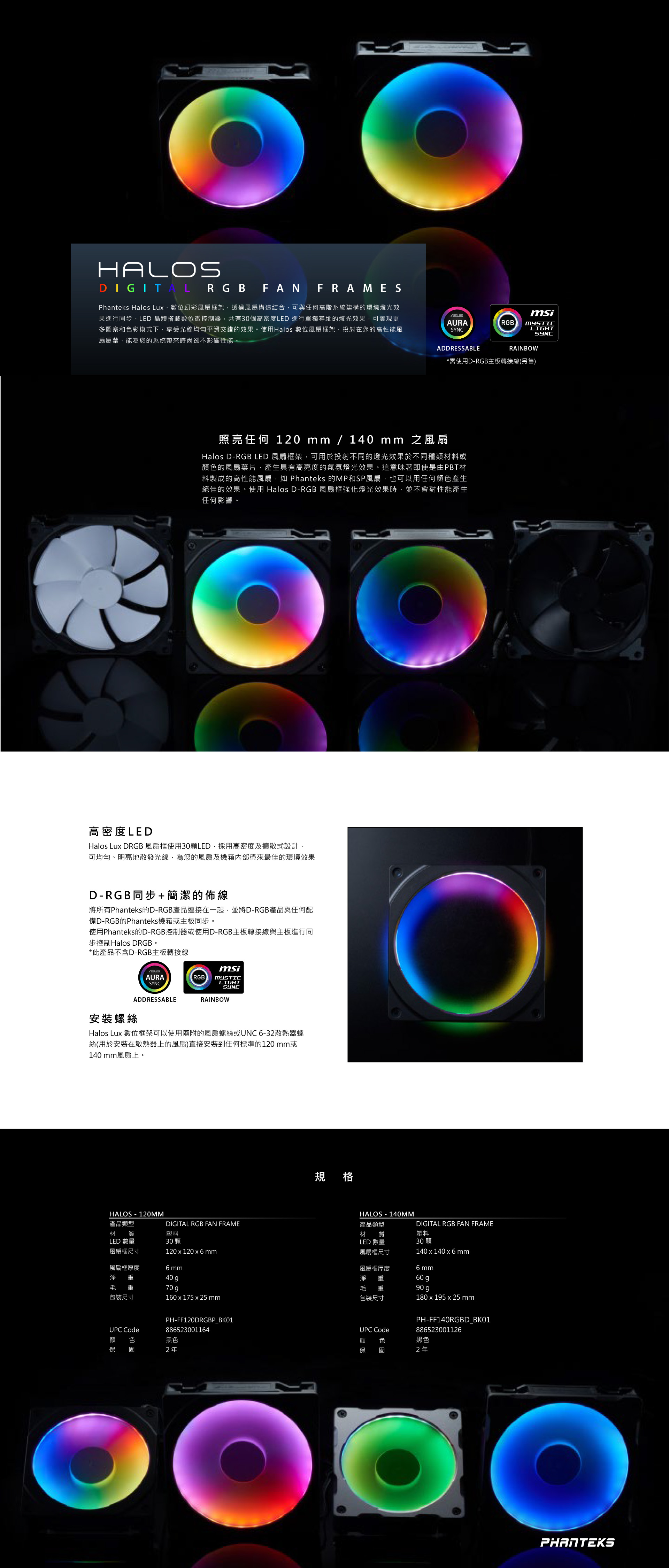 Halos 數位RGB LED風扇框架, 可用於投射不同的燈光效果於不同種類材料或顏色的風扇葉片,產生具有高亮度的氣氛燈光效果。 這意味著即使是由PBT材料製成的高性能風扇,如Phanteks的MP和SP風扇,也可以用任何顏色產生絕佳的效果。 使用Halos Digital RGB風扇框強化燈光效果時,並不會對性能產生任何影響。