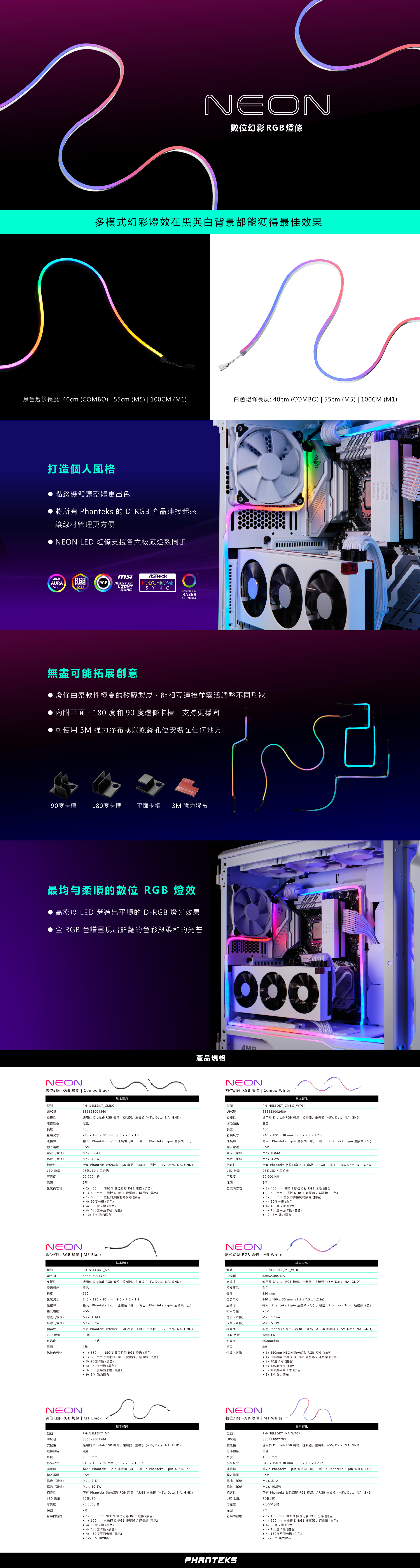 Neon Digital-RGB LED燈條外殼均採用極具柔軟性的矽膠製成,擁有高強度耐磨耗且觸感極佳的特性。內部選用高品質 LED,全色彩範圍使燈條產生舒適宜人的照明效果。輕鬆簡單的安裝方式,可依照需求安裝於各處,使硬體獲得完美照明與絢爛的燈光效果,豐富您的電腦體驗。