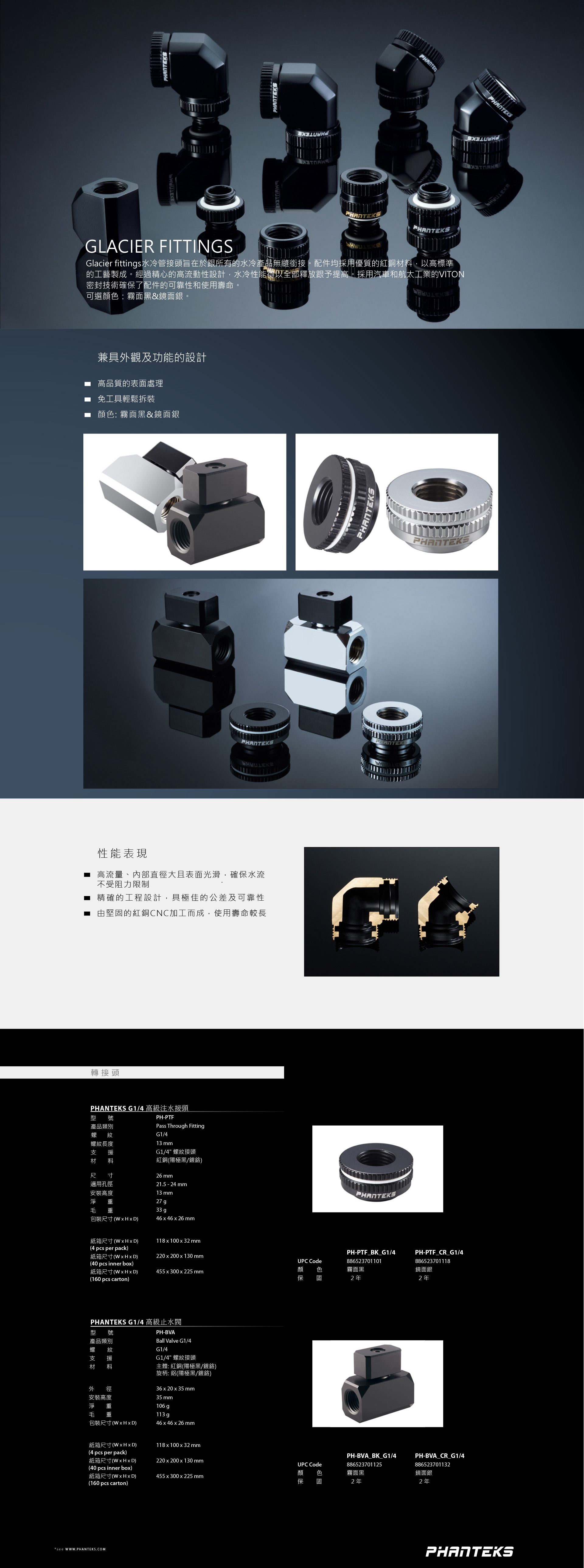 Glacier 水冷接頭系列的設計與所有Phanteks的水冷產品的外觀完美配合。 這些接頭配件均採用優質材料製成,符合Phanteks精湛的工藝標準。 Glacier 接頭採用優質黃銅CNC加工而成,流道經過精密設計,可實現高流量的設計,實現極佳的水冷性能。 航太工業使用的杜邦材料VITON止水環確保了最佳的可靠性和使用壽命。 配有霧面黑色和鏡面鍍鉻兩種選擇。