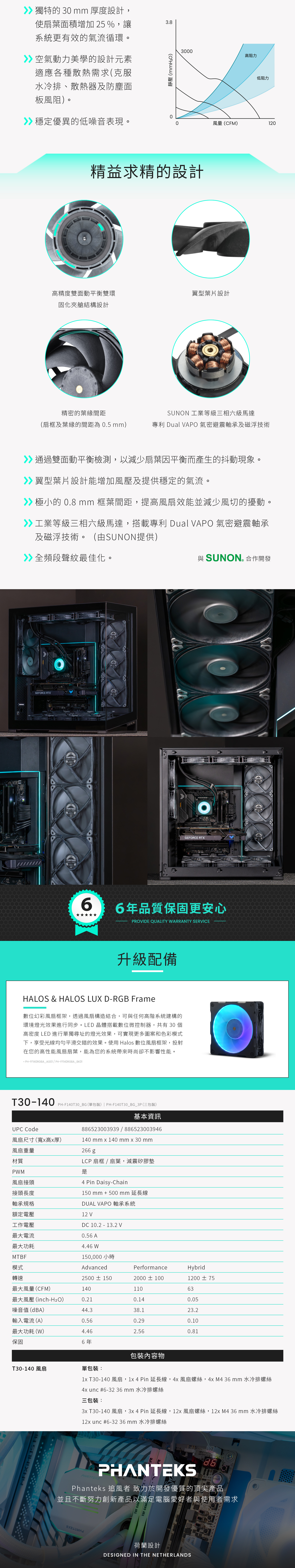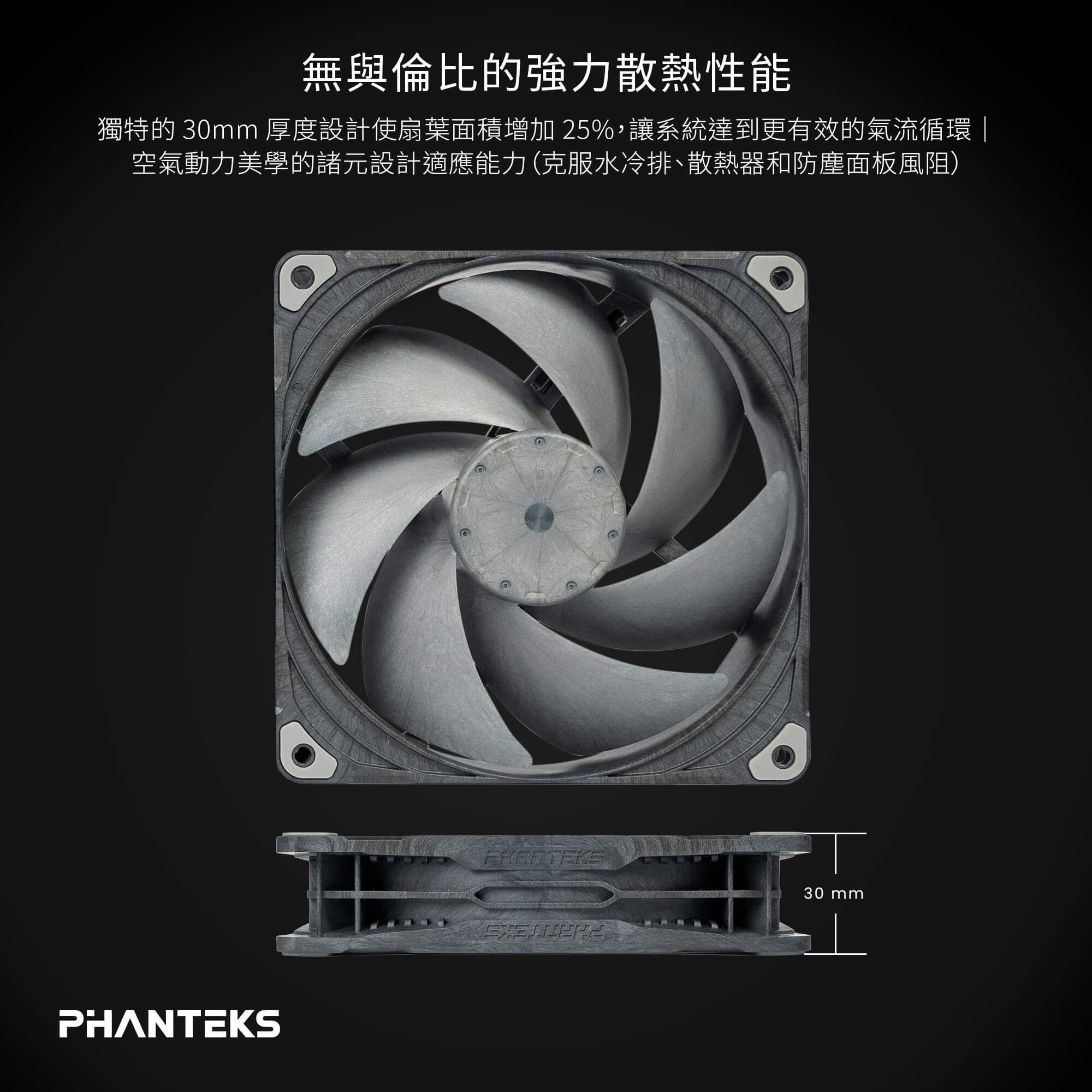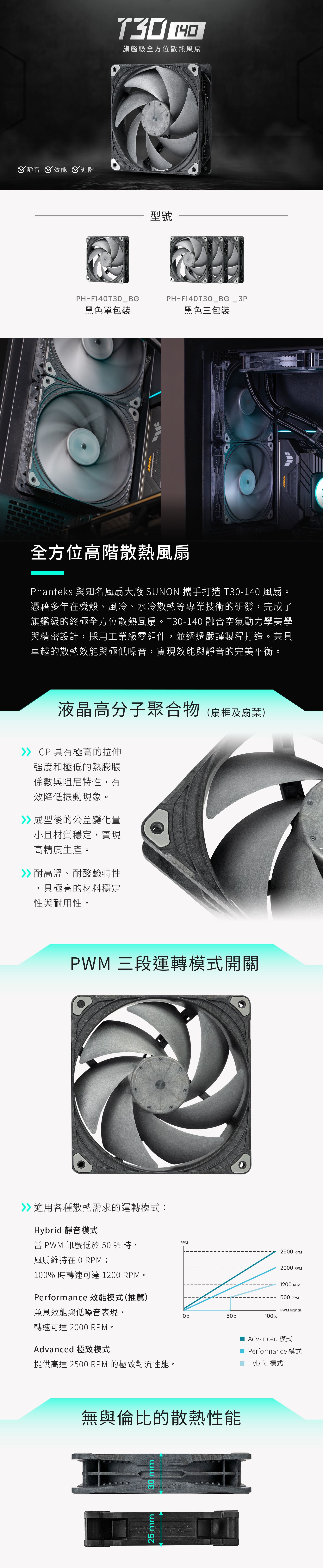 Phanteks 與知名風扇大廠 SUNON 攜手打造 T30 風扇。憑藉多年在機殼、風冷、水冷散熱等專業技術的研發經驗,Phanteks 完成了旗艦級的終極全方位散熱風扇。